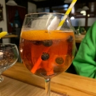Bevor ich spontan per Handy neue, etwas weitere Hosen ordern konnte, bestand die emsige Wirtin noch darauf, dass wir bitte beide jeweils unbedingt ihren hausgemachten Pflaumen- und Mandel-Likör probieren, den sie u.a. auch für den Außer-Haus-Verkauf in Flaschen anbietet.