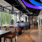 Verschiedene Bereich sind vorhanden zum Platz nehmen, mal Hohe Tische, mal niedrige Tische und auch verschieden Stuhlvarianten. Finden wir schön wie es hier angeboten wird.