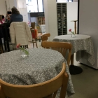 Ja wir sind hier in keinem Restaurant sondern in einer Halle mit vielen Lokalitäten und Geschäften. Schön wenn man sich hinsetzten kann und nicht im stehen essen muss. Es gibt hier runde Tische und Helle Holzstühle mit dazu. Eine Stofftischdecke befindet sich auf dem Tisch und eine Vase mit einer frischen Blume. Einfach , aber für das was es ist gibt es frische Blumen und Tischdecken, 4 Sterne