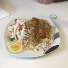 Beim anderen Gericht gab es den gleichen Salat und Basmatireis. Die Orangenscheiben gingen hier ab. Hier gab es über dem Reis etwas mehr Soße, aber ob der Reis das scharf vorab schon vernichtet hat wissen wir nicht, denn von scharf war nichts vorhanden. Etwas würzig kam sie herüber aber nicht so wie man es sich indisch vorstellt. Ein Tomatiger Geschmack kam durch , geschmorte Zwiebeln konnten wir auch war nehmen aber keine Röstzwiebeln. Das Lammfleisch war in Stückchen vorhanden und auch klasse zart und saftig geschmort. Der Vorteil war , dass Spotzl Lamm mag.