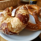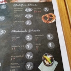 2 Pott Kaffee (EUR 6,00), 2 Mineralwasser (EUR 5,00), 2 Cappuccino (EUR 7,00), 2 Milchkaffee (EUR 7,00), 1 Kaffee (EUR 2,50), 1 Spezial-Frühstück (EUR 10,00), 2x Gute Laune-Frühstück (EUR 13,00), 1 gekochtes Ei (EUR 0,85), 1 Sweety-Frühstück (EUR 5,50), 1 Laugencroissant (EUR 2,05), 1 Laugenbrezel (EUR 1,55) und 1 Bliesgaukruste (EUR 4,90). Auf 2 Etageren brachte man Butter, Käse, Nutella, Wurst, Käse und Näpfchen mit WeißderGeierwas drin an den Tisch, desweiteren in zwei Körben unterschiedliche Sorten Brötchen und Brot. Mengenmässig durchaus ausreichend und die Backware in wirklich ausgezeichneter Qualität. Zu Wurst, Käse etc. kann ich nichts sagen, denn mit den in den Etageren gebrachte Frühstückskomponenten hatte ich nichts zu tun. Mein Frühstück bestand lediglich aus dem Laugencroissant und der Laugenbrezel sowie zwei Pott Kaffee. Der Kaffee wirklich gut, genau wie das Laugencroissant. Kleine Kritik am Rande: Aus der Brezelstadt Speyer, die dieses Backwerk auch im Stadtwappen führt, stammend bin ich in Sachen Brezel, vor allem Laugenbrezel, sehr verwöhnt. Die Kleinbauer-Laugenbrezel hat meine Erwartungen nicht hundertprozentig erfüllt; so richtig resch-knusprig war sie nicht, stattdessen eher ein wenig zu fest. P.S. Der Name Brezel leitet sich der verschlungenen Form wegen vom lateinischen "Bracella" (das Ärmchen) ab.