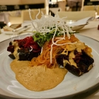 Angesichts der vorgerückten Stunde hatte ich nur zwei leichte Gänge gewählt: Vorweg den Pflücksalat (10,5 €) mit Kimchi-Yuzu-Dressing und einer Black-Tiger-Garnele als Supplement (zusätzliche 10,5€: Kempinski-Preise!). Und als vegane Hauptspeise die gegrillte Miso-Aubergine mit Erdnüssen und Glasnudelsalat.