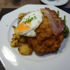Das Holsteiner Schnitzel war, auch wenn die Vorschreiberin vom Teller ihres Partners den Eindruck hatte, durchaus nicht zu fettig, sondern für mein Empfinden genau richtig (Fett ist schließlich ein Geschmacksträger). Das Fleisch war ebenfalls sehr gut, zart und saftig. Die Panierung hatte selbstverständlich ein Quantum Fett aufgesaugt, aber sie triefte nicht vor Fett, ebenso wenig wie die Bratkartoffeln. Die Speckscheibe als geschmacklicher Gegenpart zu den Bohnen war ebenfalls in Ordnung, für mich gab es an diesem Essen nichts zu mäkeln, es war deftig, rustikal und einfach lecker.