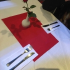 Die Tische sind mit weißen Tischdecken eingedeckt und in der Mitte gibt es ein rotes Deckchen . Besteck auf weißen Papierservietten liegt bereit und es gab eine frische rote Rose am Tisch. An anderen Tischen gab es auch Salz-und Pfefferstreuer.