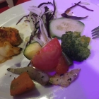 So wie wir es kennen gibt es ja eigentlich auch noch Gemüse mit dabei, also geschaut , auf den Teller gelegt und Foto gemacht. Es wurde aber nicht mehr als wir auf dem Teller hatten, halt nein, ein paar Erbsen haben wir noch gefunden. Scheibe Gurke, das Stück Tomate , Stück Gelberübe, Zuchini, Brokolie , ein Streifen Zwiebel , eine Bohne und ein Stück Weißkraut. Es war gut gegart und gewürzt, für die zusätzliche Meinung von Spotzl reichte es nicht aus.