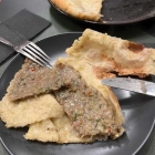Wir hatten das Trio und die Suppen als Vorspeisen gedacht, aber noch keine weitere Order aufgegeben, weil wir den Portionsumfang unseres ersten Gangs nicht einschätzen konnten. Da noch ausreichend Appetit verblieb, wollten wir jeder Teigtaschen Khinkali probieren, die mit Stückpreisen von 2,20 und 2,40 Euro angeboten werden. Sie waren aber „aus“. Wohl auch deshalb, weil an beiden Nachbartischen kurz drauf die Khinkali serviert wurden. Sie sind im Vergleich zu Pelmeni oder Kolduny riesig wie eine Faust! Man aß sie mit den Händen und allein beim Anblick fühlte ich, wie diese Teiglinge stopfen müssen. Gar nicht auszudenken, wenn mein Kollege seine ins Auge gefassten drei und ich gar meine vier Khinkali bekommen hätten! So begnügten wir uns mit einer weiteren Spezialität des Restaurants, nämlich den Khachapouiri, eine Art gefülltes Fladenbrot, was die eingangs erwähnte Polin so begeistert angesprochen hatte. Wir wählten die Variante Kubdari für 16,50 Euro mit einer Füllung aus Schweine- und Rindfleisch. Dieses war zu einem flachen Patty  geformt worden, der gut gewürzt geschmacklich überzeugte. Insgesamt eine gute Wahl und der (einzige) Höhepunkt unserer Speisenauswahl.