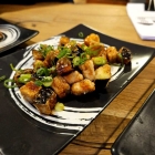 Ich beginne mit der marinierten Aubergine. Den kleinen Würfeln hat vermutlich ein kurzes Bad in der Fritteuse eine leichte Hülle verpasst. Sie sind erfreulich wenig matschig. Die Teryakisauce ist merklich, aber nicht zu intensiv, so dass sogar der Eigengeschmack der Eierfrucht durchkommt. Gepoppte Reisperlen sorgen für den Crunch. Gelungen.
