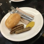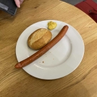 Teller eins – Rindswurst mit Brötchen und Senf für 3,50 € Rindswurst kennen wir eigentlich etwas dicker ( wurde wohl auf Diät gesetzt) Sie hatte eine etwas festere Konsistenz und war zart angebraten. Sie lag auch in der Auslage war aber nicht trocken geraten sondern noch saftig. Geschmacklich hatte sie eine dezente Paprikanote und war schön würzig. Die Wurst schmeckte uns. Das Brötchen allerding war schon länger am rum liegen, es war schon ein wenig hart geworden und Bröselte mächtig. Das war jetzt nicht unser Fall. Der Senf war halt einfacher Mittelscharfer Senf.