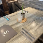 Auf dem Tisch gibt es einen Kork Untersetzter ,darauf ein Glas mit Teelicht und eine Dose mit frischer Blume. Die Tische sind bereits mit grauen Servietten und Besteck eingedeckt. Was uns ein Rätsel war warum deckt man einen reservierten Tisch für zwei Personen für vier Personen ein. Die Servietten tragen auch das Strasser Logo.