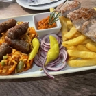 Das Personal schwirrt nur so herum, ist jedoch bestens gelaunt und nicht auf den Mund gefallen. Es scheint sichtlich Spass zu machen, hier tätig zu sein. Noch ehe wir selbst zur Bestellung übergehen können, werden wir riesiger Fleischplatten ansichtig, die quer durchs Lokal gewuchtet werden. Zur Info: die mehrgängige „Balkanparty für 2“ (79,90 Euro) umfasst so viele Bestandteile, dass ihre Auflistung eine ganze Seite der Speisekarte in Anspruch nimmt. Doch es geht auch etwas bescheidener. Neben die üblichen Klassiker wir Cepapcici, Raznjici, Pola-Pola und Pljeskavica gesellen sich jetzt auch pflanzliche Alternativen dazu. Müsste aber nicht sein. Wir machen uns angesichts des vollen Hauses auf eine längere Wartezeit gefasst, sind dann jedoch vollkommen platt, als nach gefühlt einer Viertelstunde bereits unser bestelltes Essen auf dem Tisch landet – frisch gebrutzelt und optisch ansprechend arrangiert. In der Küche scheint also nicht nur die Oma zu werkeln.