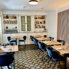 Den modernen Charakter geben dem Interieur einerseits die hellen, simplen Holztische mit schwarzem Fuß und farblich dazu passenden, mit Samt gepolsterten Stühlen ohne Armlehnen. Manche Wände hat man, als Kontrast zum ursprünglichen Weiß der Villa passend, eine schwarze Gestaltung als teilweisen Anstrich gegeben.