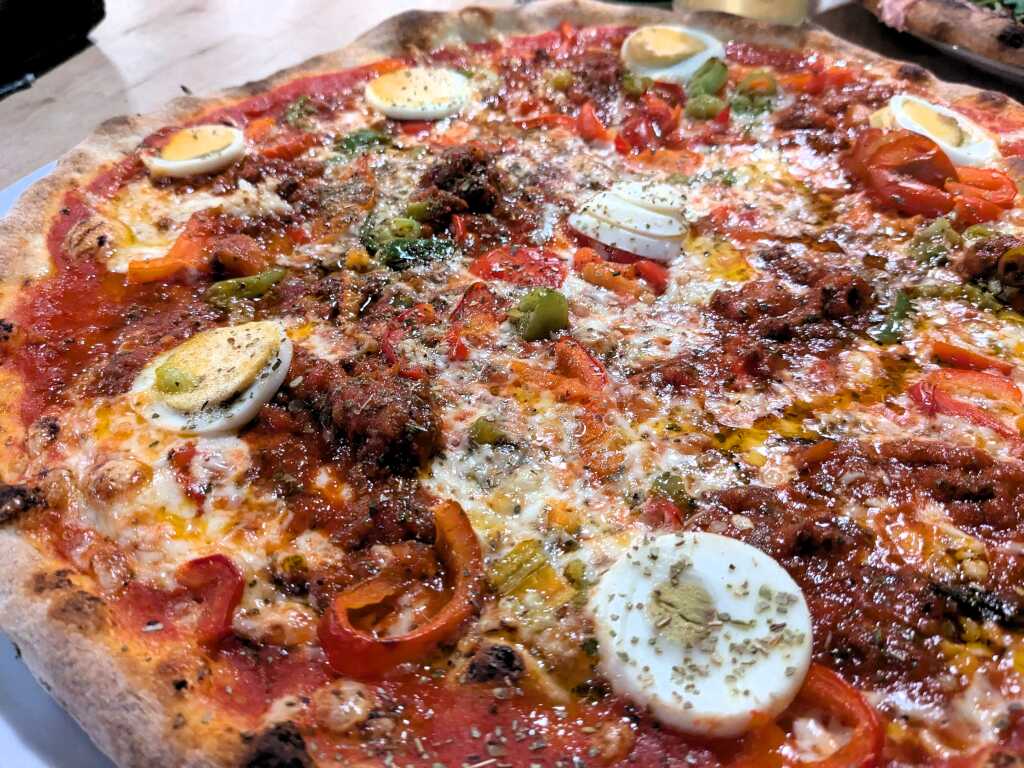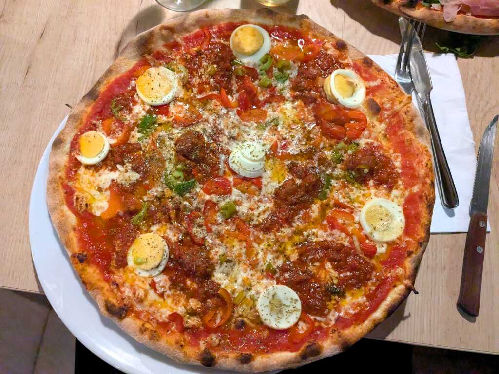 Das in Scheiben darüber verteilte, hartgekochte Ei sorgte zusammen mit den Paprikastreifen für „mildernde Umstände“ am Gaumen. Tomatensauce und Käse legten dabei im optimalen Verhältnis den schmackig-süffigen Grundstein für diesen wahrlich paradiesischen Pizza-Genuss.