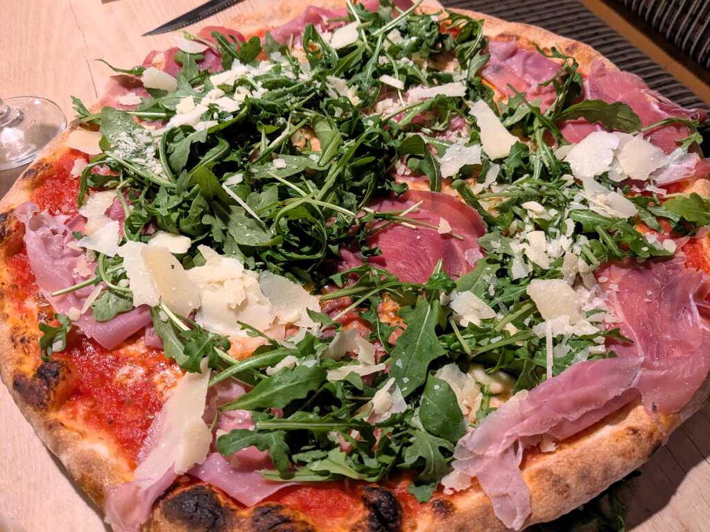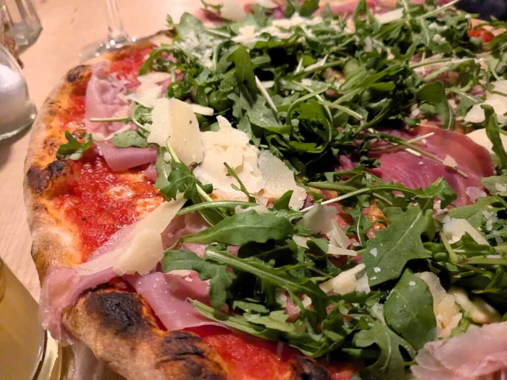Sein nach dem Backvorgang mit reichlich Parmaschinken, Parmesansplittern und Rucola-Gestrüpp ausgestatteter Rustikal-Fladen strotzte nur so vor guten Zutaten.