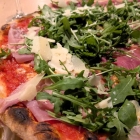 Sein nach dem Backvorgang mit reichlich Parmaschinken, Parmesansplittern und Rucola-Gestrüpp ausgestatteter Rustikal-Fladen strotzte nur so vor guten Zutaten.