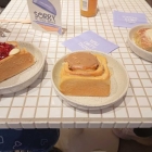 Wir geben uns vor Ort den Zuckerschock. Gegenüber der Verkaufstheke verläuft eine klein geflieste Bank die ganze Wand entlang. Davor wenige kleine, ebenso geflieste, quadratische Tische mit nicht so bequemen Stühlen. Darüber hängen futuristische silberne Halbkugeln. Was dem ganzen einen modernen Hingucker gibt. Hier herrscht Selbstbedienung, zwei junge Frauen verteilen essen und Trinken an die zahlreiche Kundschaft. Wir entscheiden uns zum Durchprobieren für die weiße Schokolade-Himbeere, Salted Caramel und Raffaello. Das Grundgerüst ist ja immer dasselbe, die Kleckse auf der Haube, Topping genannt, machen den Unterschied. Dabei wird nicht gespart. Viel Schokolade wird draufgeklebt und das macht die ganze Köstlichkeit umso süßer. Es schmeckt aber wirklich gut, man kann verstehen, warum hier soviel los ist. Auch bei den Früchten ist einiges auf der Gabel. Die Erdbeerschnecke ist mit Sahne und einer halben Erdbeere garniert, dafür ist ist ganze Schnecke rot angepinselt.
