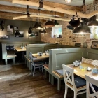 Tische mit einem Korb in dem Servietten, Messer und Gabel steckten. ( darüber kann man nun geteilter Meinung sein. Ich bin dagegen), Blümeken. Kein Salz oder Pfeffer.