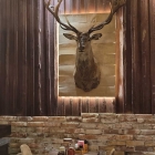 Das Restaurant ist komplett umgestaltet und modernisiert, vom vorherigen Griechen ist nichts mehr zu sehen. Stattdessen ist es auf dem Flair einer österreichischen Almhütte eingerichtet. Dunkle Holzvertäfelungen und ein dunkler Holzfußboden lassen das ganze Restaurant in einem schummrigen Licht erscheinen.