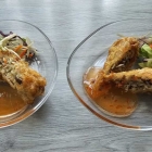 Gefüllt mit Glasnudeln, Gemüse und Hackfleisch. Warum wir beim Asiaten kein Fleisch essen, bestätigte sich bei dem krümeligen Mundgefühl des Hackfleisches. Außerdem war die Rolle sehr fettig. War aber nett gemeint.