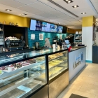 Betritt man das Lokal, so befindet sich auf der linken Seite sogleich ein langgezogener Thekenbereich, welcher mit einer Glasvitrine beginnt, in der verschiedene nahöstliche Kleingebäcke präsentiert werden. Im weiteren Verlauf werden auch noch weitere Zubereitungen zur Schau gestellt, die vor allem dem Bereich der "Mazza" entsprechen. Am Ende schließt dann der Beginn der halboffenen Küche diese Seite ab.