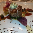 Der vierte Gang ein weiteres Highlight. Bevor aber dieser serviert wurde, fragte mich die Bedienung, ob ich den einen Wunsch hätte als Begleitung. Mir fiel als Begleiter einen Syrah (ist eine nicht sehr ertragreiche, aber hochwertige Rotweinsorte, die ursprünglich vor allem im Rhonetal kultiviert wurde) ein, daraufhin meinte die Bedienung, er habe einen da, als großes Gewächs, 59 Euro die Flasche. Wenn ich ein Viertel nehmen würde, würde er mir einen Spitzenpreis machen. Der Syrah war bombastisch gut und harmonierte perfekt zu unserem Filet vom fränkischen Angusrind, welches mit Madeira Jus, Blattspinat und fränkischen Bäckerinkartoffeln hübsch in Szene gesetzt wurde. Ein regelrechter Hammer Gang !!