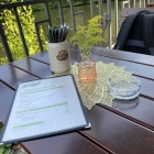 Auf dem Tisch gibt es hier ein Kunststoffdeckchen, die Karte, einen Aschenbecher, eine Vase mit frischen Blümelchen und einen Krug mit besteck und grünen Servietten.