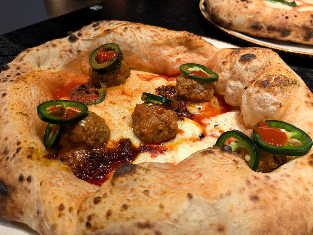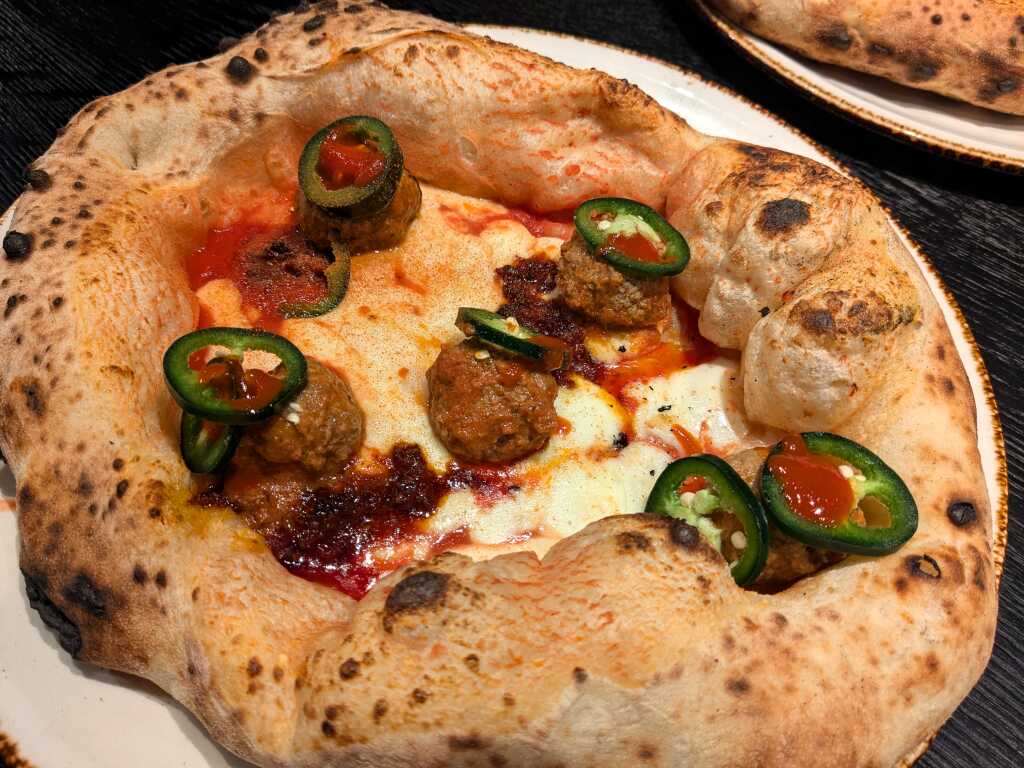 Ich zählte bei meiner als „scharf“ deklarierten „Randerscheinung“ stolze fünf Hackbällchen, die von in Scheiben geschnittenen, mäßig scharfen Jalapenos, ein paar Klecksen N’duja sowie etwas Chili-Sauce komplettiert wurden.