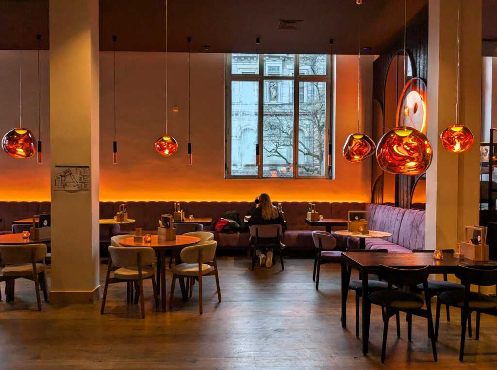 Nun, der Laden war keinesfalls komplett ausgelastet. Aber dennoch nahm zunächst niemand so recht Notiz von uns. Irgendwann kam dann einer der im weiten Saal verstreuten Servicemitarbeiter und lotste uns zu einem Tisch, der noch die Essensspuren seiner Vorgänger trug. Ging ja gut los…