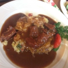 "Beutelches" (Kartoffelkloß im Leinensäckchen gegart, mit Lauch, Karotten und Solperfleisch) mit Schwarzbiergulasch (Rindergulasch im Schwarzbier gegart) - 10,50 €