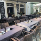 Beim Außenbereich gibt es so Art Korbstühle , allerdings sind keine Sitzkissen vorhanden. Ist im Sommer bei luftiger Kleidung immer nicht so angenehm zum länger sitzen. Es gibt eine längere Front zur Fußgängerstraße hin wo die Tische etwas eng gestellt sind. Wenn man mittig sitzt muss man schon mal etwas rum laufen zum Eingang. Zwischen den Tischen kommt man nicht durch. Am Haus selber gibt es vierer Tische zum Platz nehmen. Tischdecken sind in verschiedenen Farben vorhanden. An den Tischen bei der Hauswand gibt es auch eine frische Blume. Beschattet wird zum Teil durch eine Markisse.