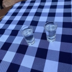 Auf dem Tisch gibt es eine blau-weiß-karierte Tischdecke, einen Ständer mit den Speisekarten und ein Blumenstöckchen. Es gab Bayrisch / deutsche Musik im Hintergrund die uns an unsere Jugendzeiten erinnerte.