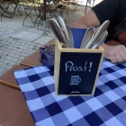 Auf dem Tisch gibt es eine blau-weiß-karierte Tischdecke, einen Ständer mit den Speisekarten und ein Blumenstöckchen. Es gab Bayrisch / deutsche Musik im Hintergrund die uns an unsere Jugendzeiten erinnerte.