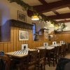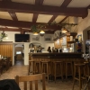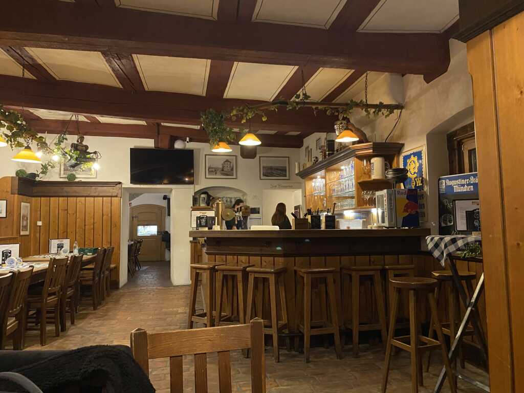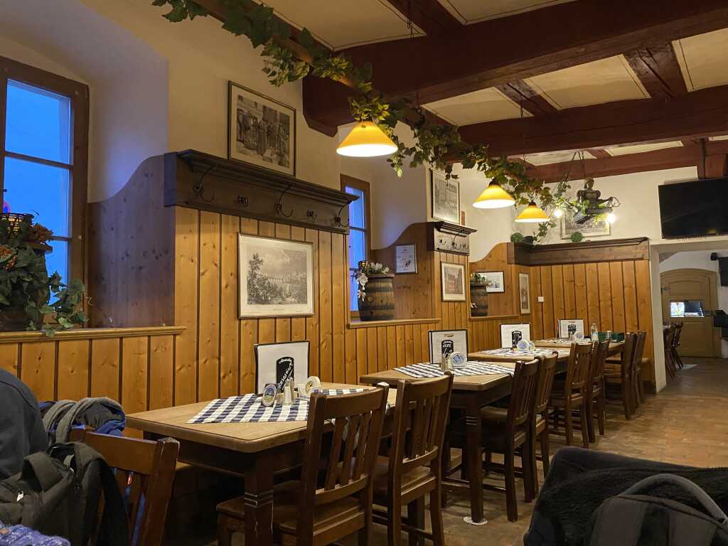 Es ist ein schönes altes Gasthaus mit Holzboden und der Holzverkleidung an der Wand. Außen rum gibt es eine Eckbank, davor dunkle Tische mit heller Holzplatte. Bilder mit alten Motiven zieren den Raum, in den Fensterbänken stehen dekorierte Bierfässer und an der Decke gibt es etwas Hopfenranken, allerdings künstlich.