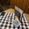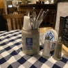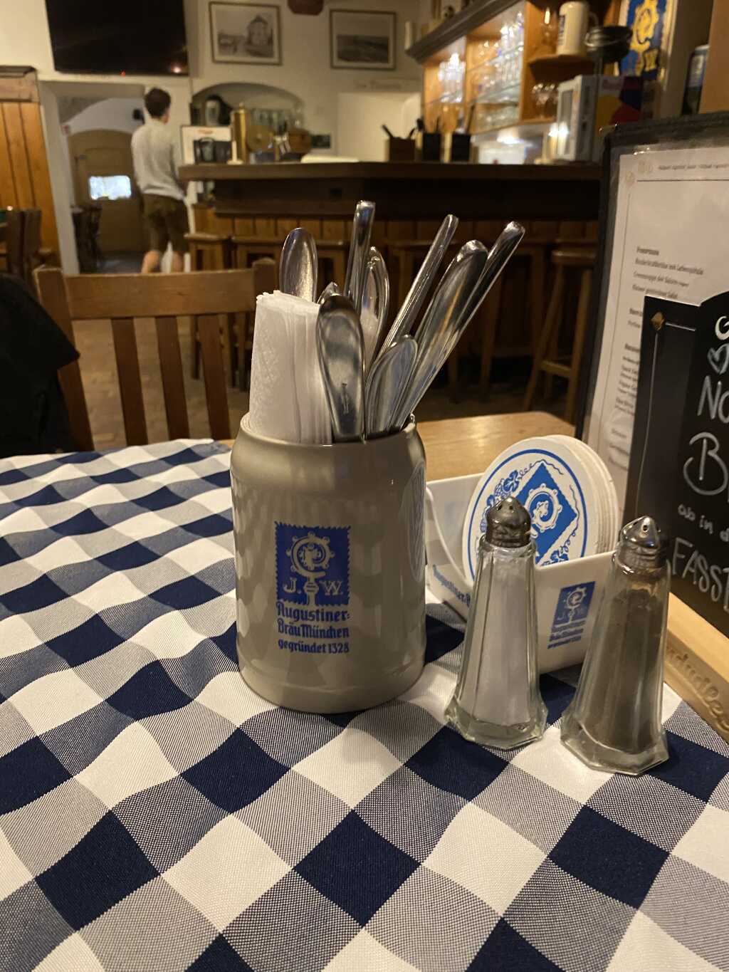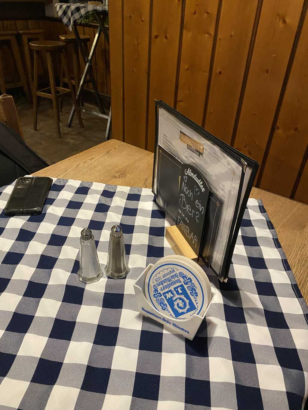 Auf dem Tisch gibt es eine blau.weiß-karierte Stofftischdecke, einen Ständer mit Bierdeckel und einen mit den Speisekarten. Salz-und Pfeffermühlen befinden sich auch noch auf dem Tisch.