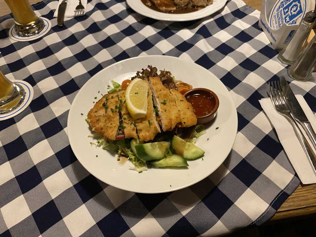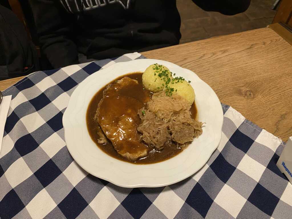 Wir hatten diesmal zwei dunkle Weizen zu je 4,90 € , einen Marillenbrand und Haselnusschnaps für je 3.- € , Schweinebraten mit Kartoffelknödel, Sauerkraut & Dunkelbiersoße für 17,90 € und großer gemischter Salat mit Schnitzelstreifen ( hätte ohne Schlemmerblock 16,50 € gekostet )