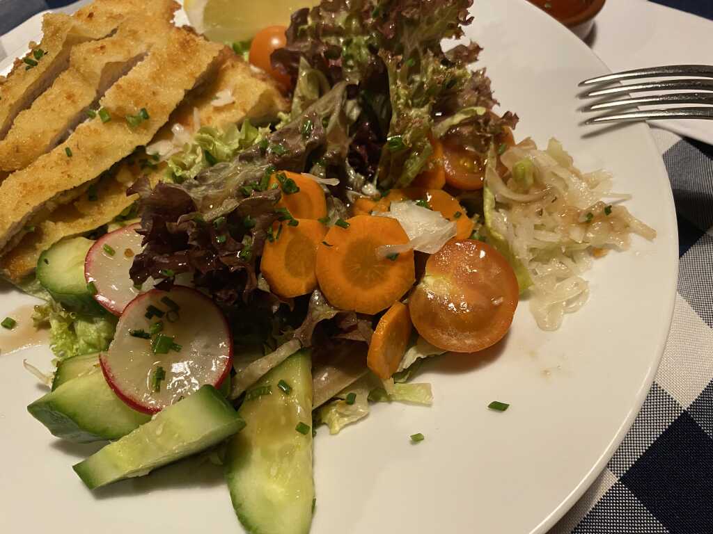 Beim Salat gab es Gurkenstückchen, halbierte Cocktailtomaten, Gelberübenstreifen, Radischenstreifen und gemischten Blattsalat. Alles war sehr frisch und hatte Geschmack. Zusätzlich gesellte sich noch ein Krautsalat mit dazu der ein schönes Säureverhältnis in sich hatte und etwas Kümmel abbekommen. Auch ein schlotziger , fein abgeschmeckter Kartoffelsalat war noch mit auf dem Teller.