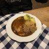 Beim Schweinebraten gab es zwei Scheiben Fleisch vom Schweinenacken. Es war nicht zu fettig und zart und saftig geschmort worden. Zwei Kartoffelknödel gesellten sich dazu. Wir würden mal sagen halb und halb. Ein schöner Kartoffelgeschmack war vorhanden, an Salz fehlte es ihnen nicht und sie hatten eine festere Konsistenz wie wir es mögen. Das Sauerkraut befand sich auch auf dem Teller. Spotzl hat hier kein Problem, ich bin da eher dafür dass man es in einem extra Schüsselchen reicht. Es war schön eingekocht mit einer schönen Säure und war einwandfrei abgeschmeckt worden. Die Dunkelbiersoße schmeckte dezent nach dem Hopfengetränk und hatte einen klasse Schmorbratengeschmack. Schön dunkel, etwas reduziert/ eingekocht dass sie nicht zu dünn war. Vom abschmecken her passte sie einwandfrei, es war auch ein feiner dezenter Kümmelgeschmack vorhanden.