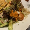 Beim Salat gab es oben drauf ein in Streifen geschnittenes Schnitzel. Es war ein tiefer Teller und was wir passender finden würden wenn man einen flachen, eventuell ovalen Teller benützt und Salat und Schnitzel nebeneinander anrichtet. Es ist hier etwas schwierig zu schneiden, unten der Salat und am Rand kippt der Teller. Das Schnitzel war schön paniert und rausgebacken worden. Es war zart , saftig und nicht fettig. Am würzen fehlte uns nichts. Es gab noch einen Schnitz Zitrone mit dazu. Ein Schälchen mit einer Soße zum dippen gab es noch mit dazu. Wir würden sagen das es eine Art Salsa war. Leichter Tomaten-Paprikageschmack kam durch und sie hatte eine schöne würze, war lecker zum Schnitzel.