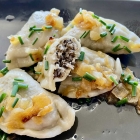 Diese Baguettes standen aber ja sowieso für diesen ersten Besuch nicht im Fokus meines Appetits auf polnische Küche. So entschied ich mich schließlich für die „Pierogi mit Pilz-Kraut-Füllung“ im Umfang von Stück für 5,6 €, die ich mit Schmelzzwiebeln und Schnittlauch getoppt haben wollte. Nach etwa 10 Minuten servierte mir der junge Herr dies auch schon direkt an den Platz.