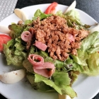 Zum kühlen, herbgehopften Pils aus dem Saarland gesellte sich bald die Calabria-Version eines „Salade Nicoise“. Die freundlich-förmlich auftretende, aber ansonsten eher unauffällig agierende Servicedame brachte mir ein mit üppiger Dosen-Thunfisch-Auflage, Schinkenröllchen, hart gekochten Eier- und Tomatenspalten garniertes Blattwerk der knackig-grünen Art.