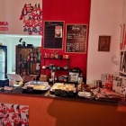 Nach meinem Marsch vom Hotel durch eine überraschender verschneite Innenstadt (Im Februar! In der Börde! Verrückt…) und dem Auffinden des eher unauffälligen Eingangs bot sich mir ein überraschend heimeliges Bild: Warme Farben, bequeme Loungesessel, ein Flügel, Plakatkunst und eine Lasershow an der interessanten Decke machen deutlich, dass das WEWERKA den Zusatz „Art-Café“ völlig zu recht trägt.