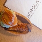 Platz nehmen wir an einem der einfachen Holztische, etwas erhaben auf einer kleinen Empore und mit gutem Ausblick auf das Angebot. Der Raum erstreckt sich über zwei Ebenen, ist somit leider nicht komplett barrierefrei begehbar und auch nicht immer perfekt abgesichert. Hoffentlich kippt hier nicht mal ein vom Barolo euphorisierter Gast rücklings nach hinten. Etwas befremdlich ist auch die Tatsache, dass die einzige Toilette der Location zugleich als Lagerplatz für Prosecco-Kartons dient. Wahrscheinlich aber nur am Eröffnungstag. Positiv erwähnt werden muss auf jeden Fall die blitzeblanke Sauberkeit: alles adrett, sehr proper und überaus ansprechend.