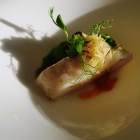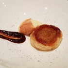Nur leicht angeflämmt wurde die butterzarte Makrele präsentiert. Ins Auge fiel neben dem Fischfilet sofort die halbierte Mikrogurke. Nur ca. 4 cm lang, aber das volle Gurkenaroma. Herbstlich hier wieder der stimmige Hokkaidokürbis, aromatisiert mit Ponzu.