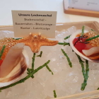 Kräftiger im Geschmack natürlich die Tartelette mit geraspeltem Mimolettekäse. Darunter verborgen das gedörrte Entenherz. Eine kräftig-aromatische Ergänzung zum Käse.