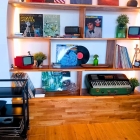 Nachdem wir die Speisekarten erhalten haben, passiert relativ lange gar nichts. Wir werden unruhig, denn die Zeit läuft ab. Der Service agiert herrlich tiefenentspannt und meditativ und schaut niemals nach links oder rechts, sondern ist in den jeweiligen Handgriffen versunken. So haben wir erst mal viel Freude dabei, das Ambiente eingehend zu studieren. So ganz erschliesst sich das innenarchitektonische Konzept jedoch nicht. Die Wände zieren Retro-Elemente wie Schallplatten, Musikkassetten und nierentischförmige Spiegel; auf dem Weg zur Toilette wird man einem ganzen Schrein an Musikalien ansichtig. Doch was hat Roy Black mit koreanischem Essen gemeinsam? Auch das zusammengewürfelte Mobiliar, sowie eine Gläserkollektion aus den 1960er Jahren lässt an Haushaltsauflösung denken – oder an eine WG aus unserer Jugend.