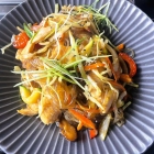 Als uns endlich die Bestellung gelingt, geht dann doch alles ganz schnell. Das heisst: in der Küche ist man ziemlich flink und emsig zugange. Sehr schmackhaft und gut gelungen ist das Japchae, ein offenbar traditionelles Gericht mit flutschigen Glasnudeln, fast noch rohem, sehr bissfestem Gemüse (Paprika, Lauchzwiebeln, Pilzen) und einer Wahlzutat, die in unserem Falle Huhn ist. Für insgesamt 15,50 Euro hat man so ein buntes, vielfältiges, leider geschmacklich jedoch etwas fades Hauptgericht. Schnell bemühen wir uns noch um Sojasauce und eine süss-saure Sauce zum Aufpeppen. Auch die gedämpften Mandu (7,50 Euro) sind optisch schön anzusehen und werden ansprechend serviert, rangieren für unseren erwartungsfrohen Gaumen jedoch eher unter Schonkost. Könnte man auch zahnlos einschlürfen. Vielleicht wäre die gebratene Variante die bessere Alternative gewesen? Glücklicherweise wird hier ein kleines Schälchen Sojasauce gleich mit dazu gereicht. Wir schwenken alles mit einer Cola Zero (4,60 Euro) und einem nicht sonderlich aufregenden Riesling (0,2 Liter für 5,90 Euro) hinunter. Dass beides auf einem Untersetzer der hiesigen Schönbuchbrauerei serviert wird, kann man als Mixed-Media-Intervention interpretieren.