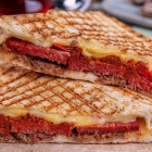 Dann bestrich er das Brot, legte frische Kräuter und Gemüse darauf, verstrich die Paste und legte die Wurst darauf. Nun klappte er das Sandwich noch zu und steckte es in eine Art Waffeleisen.
