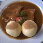 Meine Gattin und das Geburtstagskind entschieden sich für das Hirschgulasch (15,90 €). Eine schöne Portion Gulasch, zwei selbstgemachte Knödel mit Semmelbröseln auf dem Kopf, viel schmackhafte Soße. Dazu Preiselbeeren mit einem Klecks Sahne obendrauf. Das mag nicht jeder, wenn die Preiselbeeren in der Soße liegen, aber den beiden hat es hervorragend geschmeckt und mit der Sahne wurde die Soße noch etwas verfeinert. Eine sehr gute Qualität wies das Fleisch auf. Wunderbar zart und schön im Biss, was bei Hirschgulasch manchmal nicht selbstverständlich ist. Sie waren jedenfalls äußerst zufrieden.