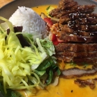 Zitronengras und Chili vereint mit frischem Gemüse, serviert mit Reis, Paprika, Sojasprossen, Koriander, Salat, Sesam und dunkler Austern-Sojasauce. Wahlweise mit: