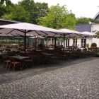 Vor den Türen ist ein riesiges Außengelände: Tische und Schirme stehen bereit – aber heute könnte es regnen und daher waren alle Gäste drinnen.
