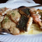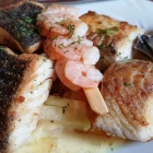 Gebratene Filets von fangfrischen Ostseefischen und Garnelenspieß auf saisonalem Gemüse, dazu reichen wir Reis und Salzkartoffeln - € 45,00.